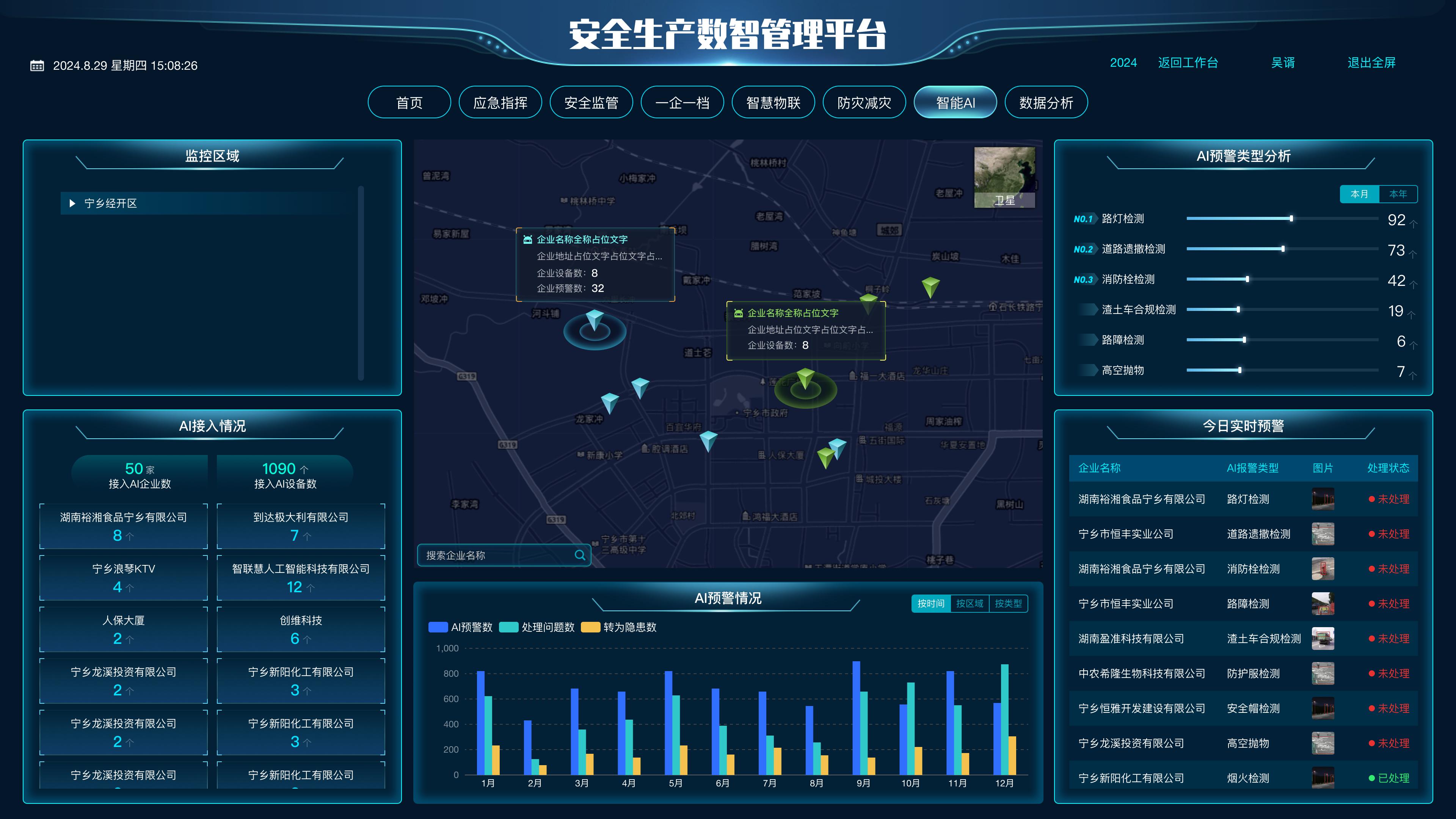 通过“智能AI”数据看板,随时查看辖区内各企业每日警情,AI预警情况,针对预警类型进行智能统计分析,直观展示每月每年高频违规类型和数量。