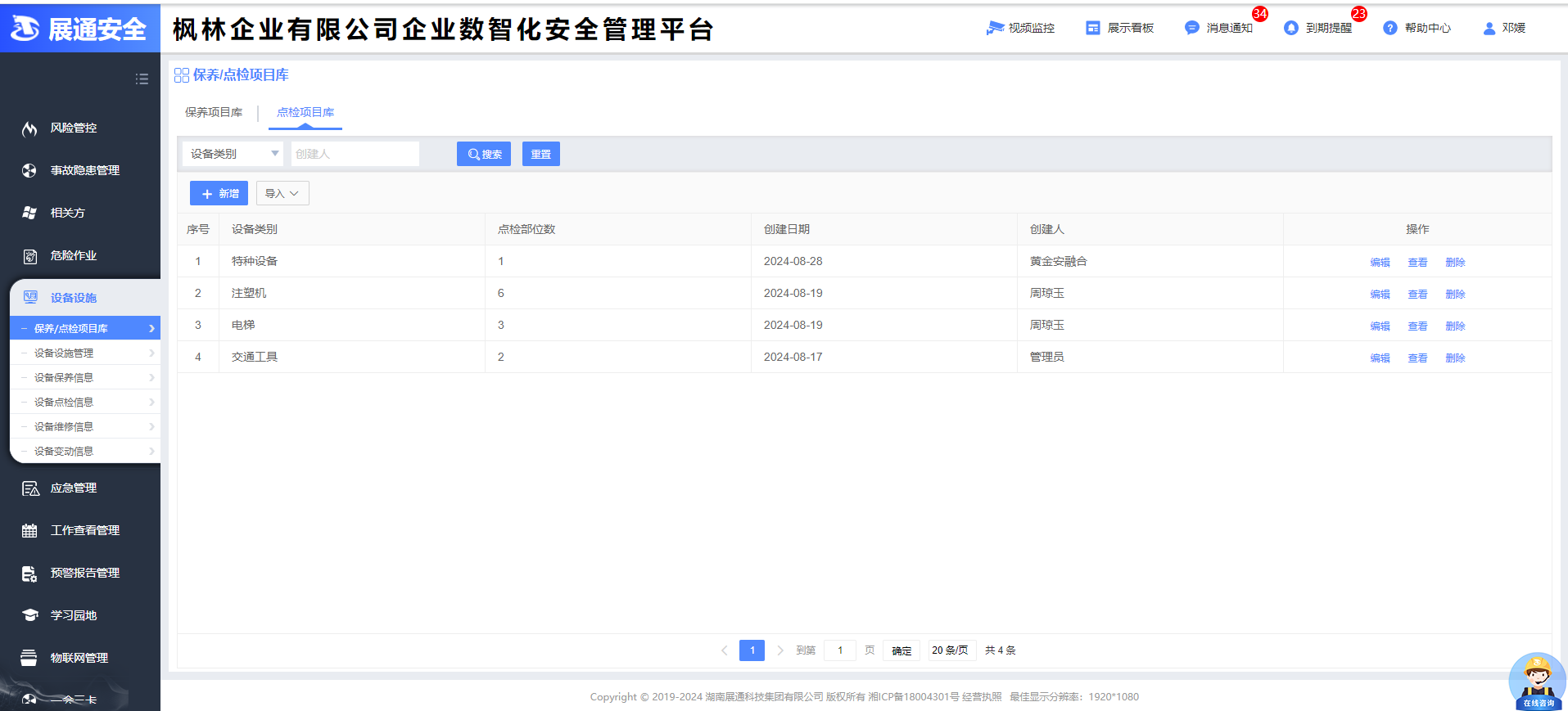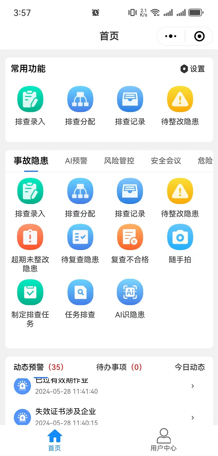 企业数智化安全管理平台(俗称企业端)汇集企业管理、风险管控、隐患管理、体系运行、危险作业、AI预警、AI识隐患、应急管理、预警动态、一会三卡、物联网管理、相关方、设备设施、学习园地等功能于一体,旨在构建标准化、规范化、便捷化的管理流程,引导企业自主开展安全管理工作,建立健全全员安全生产责任制,全面提升企业安全管理数智化水平。