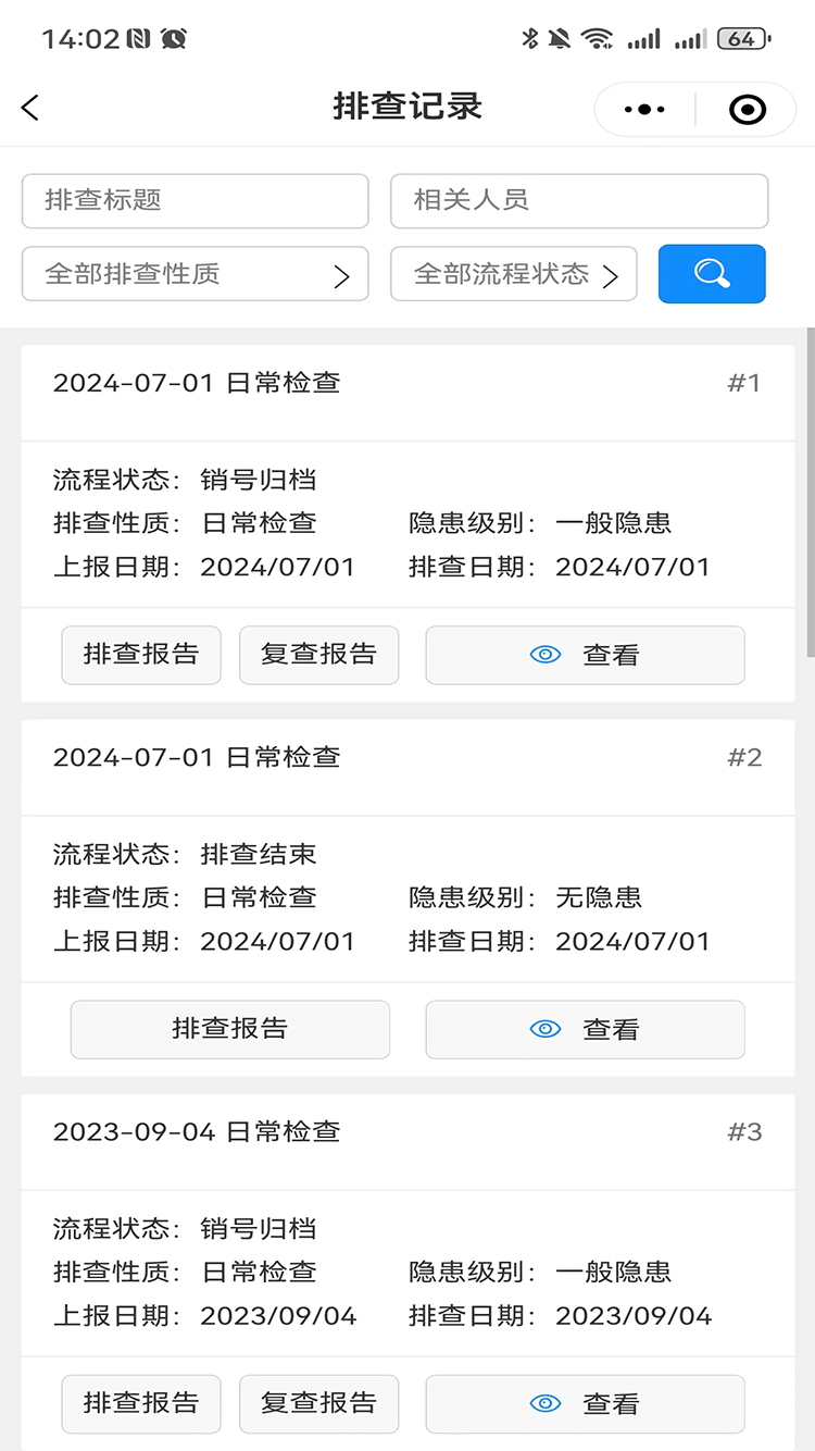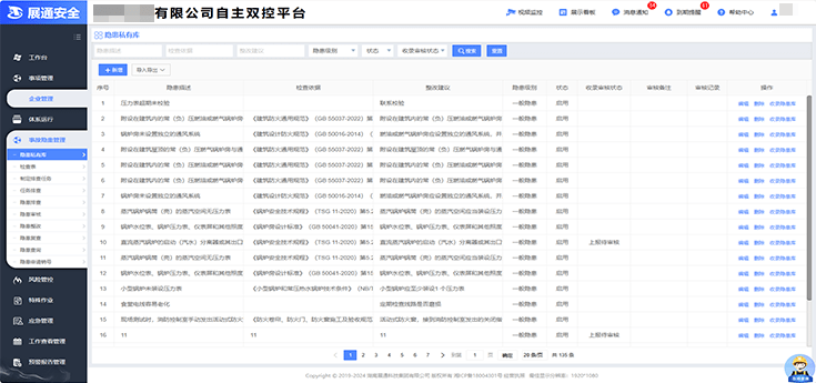 企业安全管理人员可依托检查表库、隐患数据库或者自主新增,完成隐患的排查、上报、整改、复查、归档等一系列流程运转,实现隐患闭环管理;根据隐患排查治理信息,自动生成安全检查报告,支持线上打印及一键导出。